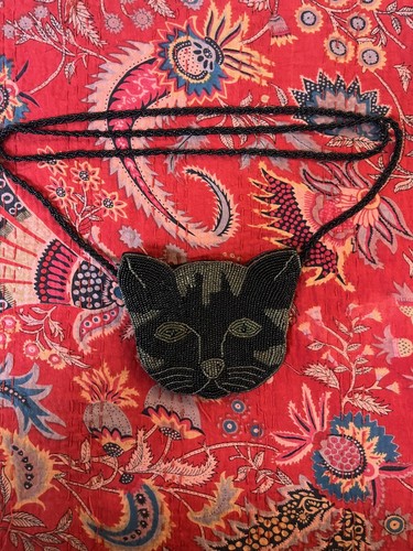 This vintage beaded cat purse from the 1970s features a unique cats design, making it a charming retro accessory. The multi-color purse has an art deco look and is made of beaded material, adding a touch of whimsy to any outfit. Perfect for special occasions, this original handbag is a must-have for women who appreciate vintage style and quirky details.