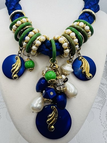 Vintage 80s Runway Statement Necklace Blue Rope Faux Pearl Charm Cluster Bold 18 inches