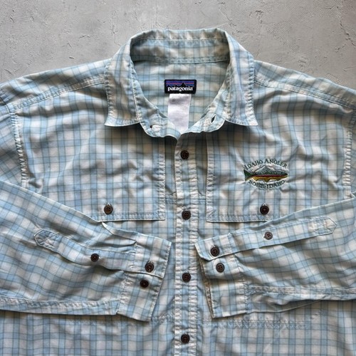 Beautiful colors and pattern on this one. Love the little salmon embroidery on it! Tagged mens large. Not entirely sure the material, it is very lightweight and breathable. Dm questions, ships next business day. #vintage #patagonia #gorp #fishing #buttonup granola outdoors