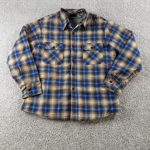 Features: Full front button closure, point collar, long sleeves with button cuffs, curved shirttail hem, and two chest pockets with flap and button closures. Pre-owned Sears quilted flannel shirt with light overall wear from prior use and laundering.