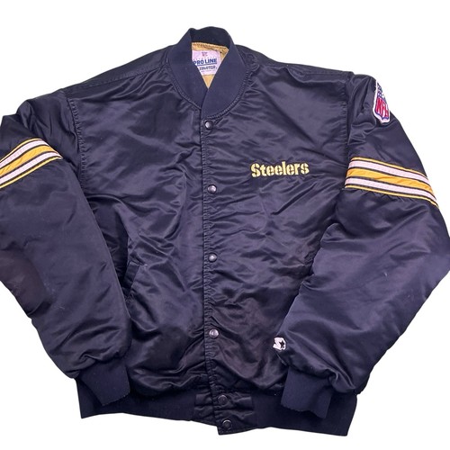 Vintage Pittsburg Steelers NFL STARTER 80s/90s satin bomber jacket. Made in the USA. High quality. Quilted lining. Stitched logo. Two front slide pockets. Tagged as an XL, measures more as a large. 24 inches pit to pit, 25 inches long. Left shoulder NFL patch has some loose stitching, has a couple of snags and some light discoloration as shown in photos. Smoke and pet free home. πΊπΈ π
