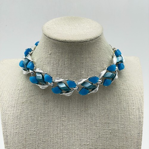 Blue thermoset lucite panels with swirl design. Adjustable hook clasp with extender chain. Preowned jewelry typically shows signs of wear. 14" length.
