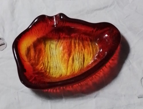 This Vintage, Hard to Find, BLENKO Amoeba Trinket Dish/Ash Tray in Amberina color is a one-of-a-kind decorative piece of Mid-Century Modern art glass. Handmade in the United States during the 1960s - 70s, this free form Trinket Dish/ Ash Tray features a glossy finish and a distinctive Amoeba shape. With a production technique of hand-blown glass, this piece showcases the craftsmanship and creativity of Blenko's glass artistry. Perfect for collectors of vintage decor or fans of unique glassware, this ashtray captures the essence of 1960s Mid-Century-Modern design aesthetics.