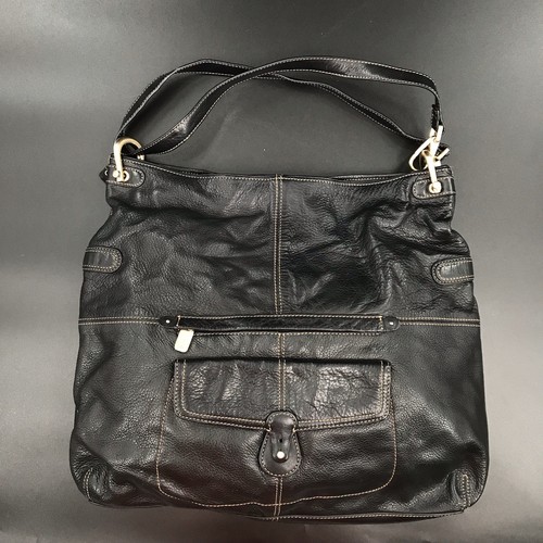 This vintage black leather Liz Claiborne shoulder/crossbody bag with gold hardware is a stylish and classic accessory for women. The square-shaped bag features a zipper closure, black leather shoulder strap, and gold metal hardware accents. The interior has a three-section design with a zippered front pocket and black fabric lining. Perfect for travel, parties, casual outings, or business meetings, this large bag exudes a timeless 90s charm. Handmade with a solid black exterior and metal hardware, this designer bag from Liz Claiborne is a must-have addition to any fashion-forward wardrobe.