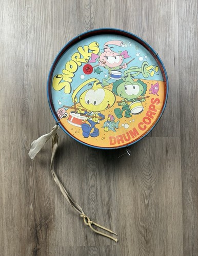 80s VINTAGE Snorks Drum Corps 11” Drum Toy TV Promo RARE OBSCURE The item is in overall decent condition. DOES NOT INCLUDE DRUMSTICKS. There is a hole on one side as well as some pen writing. One the reverse side there is a sticker on the cover. The metal casing has some spots of tarnish/minor rust.