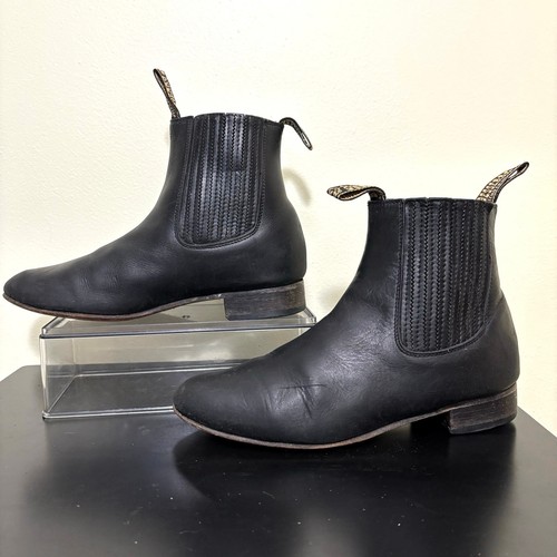 Handmade-style construction with leather uppers, leather lining, elastic side gores, and classic ranch roper silhouette. Condition:Good pre-owned condition. Leather shows typical wear but no major defects.