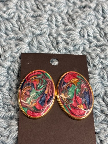 Oval Stud Earrings Multicolor Enamel Swirl Goldtone Vintage 80s Mod 1.5 inches Inventory: 4