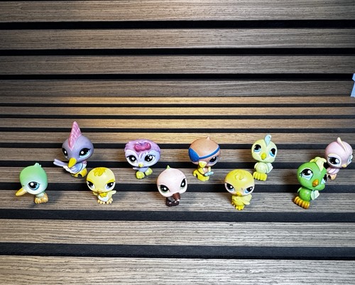 The product is a lot of 10 vintage Littlest Pet Shop figures featuring birds, manufactured by Hasbro. These collectibles are designed for children ages 4-7 and are part of the popular Littlest Pet Shop character family. Made in China, these figures bring the adorable and imaginative world of the Littlest Pet Shop to life for young collectors and fans of the franchise.
