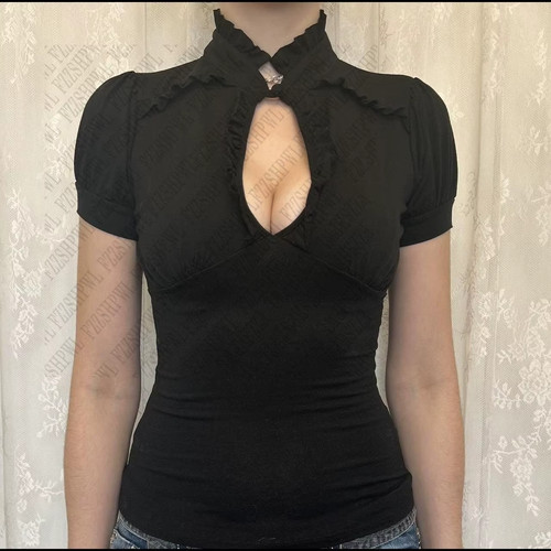 The fitted silhouette hugs the body beautifully, creating a flattering and feminine shape. Ruffled neckline & collar detail. Short sleeves. Black fitted top.