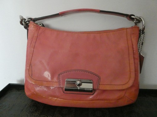 This is a Coach patent leather shoulder bag. Turnlock closure has clean engraving (“COACH”). The purse has 1 smaller pocket outside. Made from high-quality leather with a patent finish, this bag exudes sophistication and durability.