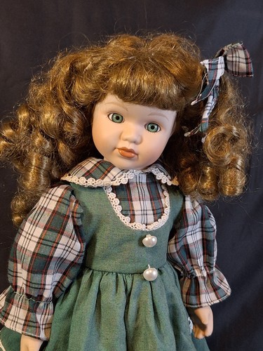 Hair: Voluminous, thick brown curls in excellent condition, styled with a matching plaid hair bow. Long-sleeved plaid blouse with ruffled lace cuffs. Condition: Excellent condition. This doll has been well-cared for.