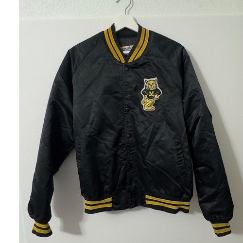 Made in the USA, this bomber-style jacket features a quilted lining for added warmth and a snap-front closure. The front is adorned with a detailed Truman the Tiger patch, while the back showcases a large arched 'MISSOURI' applique in collegiate gold and white.