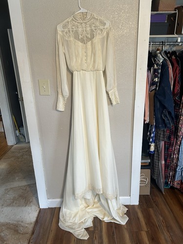 Gorgeous prairie-style wedding dress with sheer bodice overall. Some loose button loops and a small mark on skirt near waist (pictured). Honestly in pretty amazing condition. Pretty for any re-seller or bride. Bust - 32 inches Waist - 24 inches