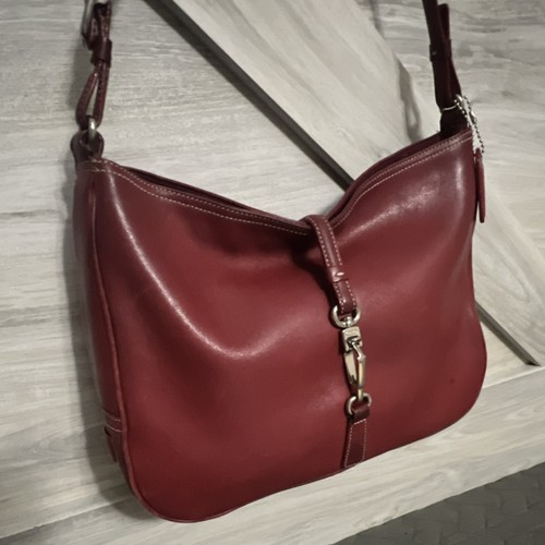 The Coach 2002 Red Clip Closure Shoulder Bag is a stylish and classic accessory for women. Made of leather with a solid red exterior, this rectangular shaped bag features a clip and snap closure, adjustable shoulder strap, and silver hardware accents. The interior is lined with fabric and includes inner pockets for organization. Perfect for casual occasions, this shoulder bag exudes a timeless and sophisticated look with its red exterior and brown lining. With the signature Coach brand tag and adjustable strap, this piece is a versatile and practical choice for everyday use. See pictures for wear marks. I don’t see any major scratches. Box 9