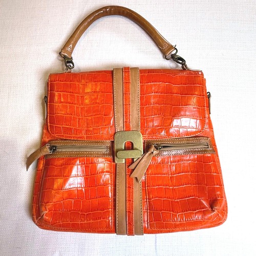 Style: Satchel, Top Handle. Van Eli handbag crafted from vibrant orange croc-embossed with contrasting tan trim and a sturdy top handle. This structured piece features a unique brass-tone latch closure on a central vertical strap, flanked by two functional front zipper pockets with leather pulls.