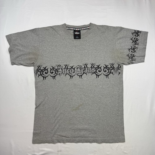 The product is a vintage 90s Jnco Jeans grey t-shirt in size large, featuring a grunge design with fading and stains. Made of a cotton blend material, this short sleeve shirt is a graphic tee with a 90s American theme. The brand is Jnco Jeans, and the shirt is an original piece from the United States. This men's vintage clothing item is a classic addition to any wardrobe, showcasing the grunge look popular in the 90s. Pit to pit 21x28