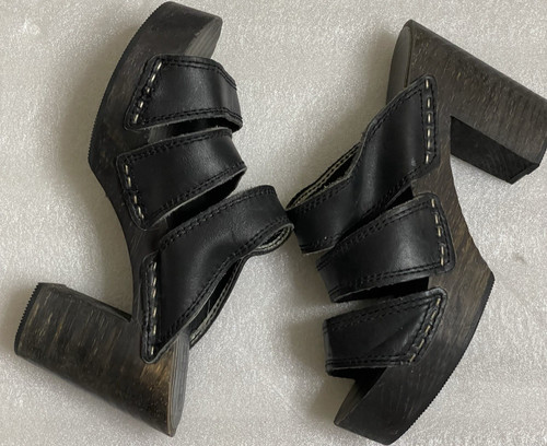 The product is a pair of vintage 90s Y2K black Euro Club leather clogs sandals in size 7.5. These open toe sandals feature a slip-on closure, mid heel height, and a block heel style. Made with leather and synthetic outsole material, they are perfect for travel, parties, or casual wear. The black sandals also come with logo accents and breathable features, reflecting a hippie and bohemian theme from the 90s era. Perfect for all seasons, these stylish and unique clogs sandals are a must-have for any fashion-forward woman looking to add a touch of vintage flair to her wardrobe.