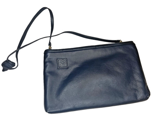 The Vtg Anne Klein For Calderon Dark Navy Leather Crossbody Shoulder Bag Purse is a stylish and versatile accessory for women. Made from high-quality leather, this medium-sized bag features a solid dark navy exterior with gold hardware accents and a detachable crossbody strap for added convenience. With a zip closure and inner pockets, this vintage shoulder bag exudes timeless elegance and sophistication, perfect for adding a touch of luxury to any outfit. The black leather lining adds a classic touch to this chic and practical accessory.