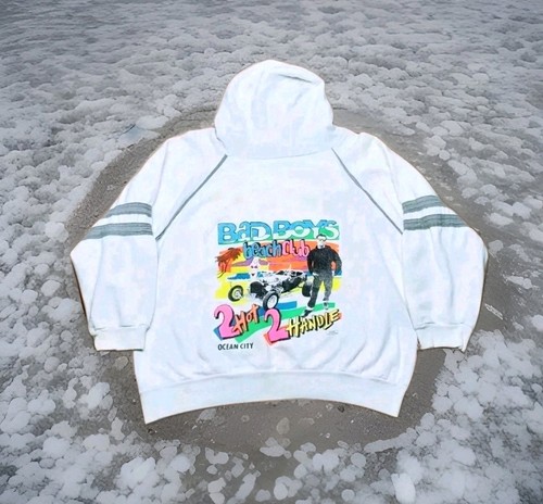 Has Ocean City with shells, sea gulls, and palm trees on front. Front graphic is dated 1988. Has hoodie but is missing adjustable tie. Back has "Bad Boys beach club, 2 hot 2 handle, Ocean City," and a man and woman beside a car, dated 1990.
