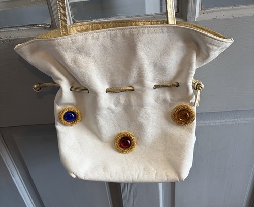 Crafted from supple white pebble-grain leather, it features a unique "Byzantine" design with three oversized, poured-glass cabochon gemstones (Sapphire Blue, Ruby Red, and Amber Gold) set in ornate, textured gold-toned bezels.