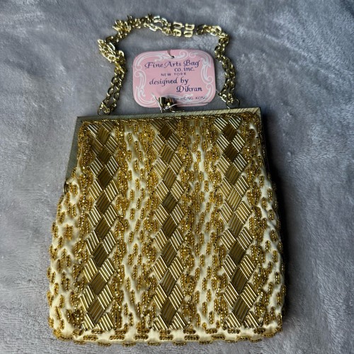 This is new old stock, it has its original brand tag attached! A gorgeous vintage evening bag, so sparkly and elegant! Would be perfect as "something old" for a bride's wedding day. Could be your accessory to the next big formal event. This was made in Hong Kong in the 1960s. The beads form a repeating diamond design on both sides. There's a chain attached that can be doubled to adjust the strap length. You can also tuck the strap into the bag to use it as a clutch. The kiss lock closure holds tight. Thank you for shopping Creekola Market! Gold Beaded Purse Evening Bag Handmade Hong Kong Kiss Lock Vintage Original tag