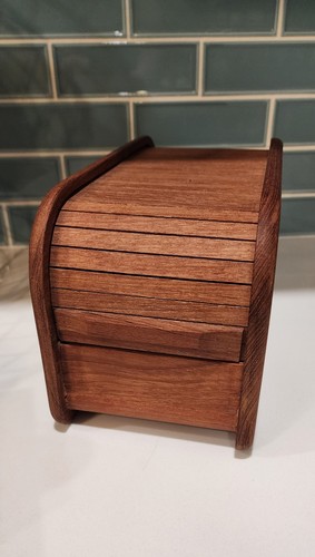 The VTG Kalmar Designs Teak Wood Tambour Roll Top Storage Box is a stylish and functional piece of furniture that exudes a Mid-Century Modern aesthetic.