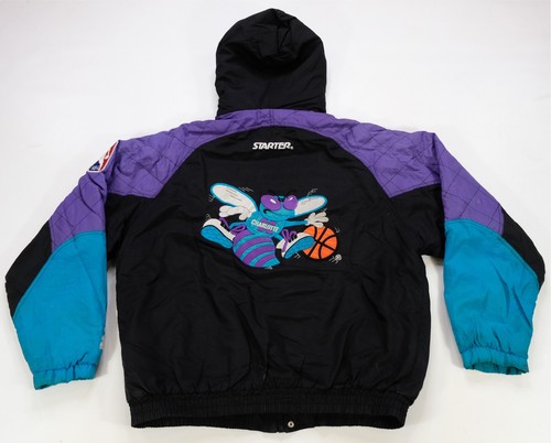 Rare VTG Charlotte Hornets Hooded Puffer Parka Jacket 90s Black Teal L