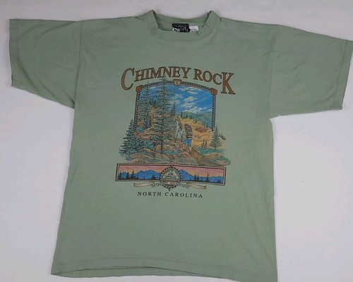 Cool piece and nice quality tee green color with large multicolor nature scenic hiking art print on front. Good condition, has light general wear/slight fade, faint stain near print, couple small marks and small distress hole as shown.