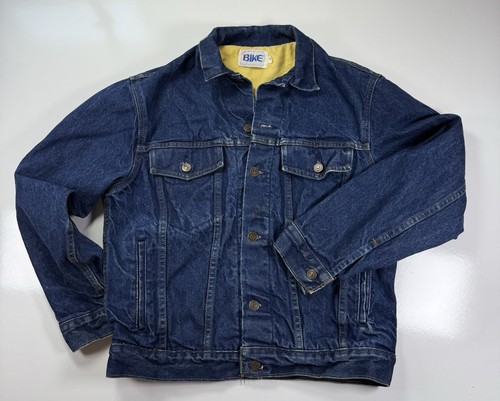 Bike vintage denim trucker jacket, size Small (see photos for measurements). Blue 100% cotton outer with contrast yellow fleece lining, button front, dual chest pockets, and side pockets. Classic trucker style. Used vintage condition with wear consistent with age small stain on front shown in photos. No holes or tears seen. All buttons intact. Measurements shown for best fit. This is a preowned item and may show normal wear. I inspect every piece under bright lighting and photograph all noticeable flaws. Please review all photos closely, they are the most accurate representation of condition. Item is sold exactly as shown.