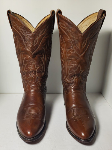 The Vintage Tony Lama Mens Brown Leather Embroidered Western Boots in size 12D are a stylish and classic choice for any man's wardrobe. Featuring an almond toe shape and pull-on closure, these boots are perfect for a variety of occasions including casual wear, workwear, and even special events. Made with high-quality leather, these boots boast intricate embroidered accents that add a touch of Western flair. With a mid-calf shaft style and durable outsole, these boots are designed for comfort and long-lasting wear. Whether you're a cowboy at heart or simply love a vintage look, these Tony Lama boots are sure to make a statement.