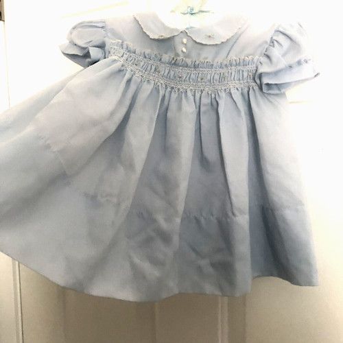 Smocked in white front with the tiniest little pink rosebuds. Round collar with tiny embroidered scalloped edge and tiny embroidered pink rosebuds. Hand stitched in Philippines - exquisite even stitching, gorgeous quality throughout!