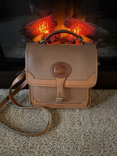 This is a tan vintage Dooney and Bourke crossbody bag. It’s made in the USA. Great condition to be vintage. It has a buckle closure, top handle and a crossbody strap. It does not have the hang tag. It has a slip pocket on the back on the purse. A slip pocket on the front. The inside of the purse has a zip pocket and a slip pocket. The hardware is brass.
