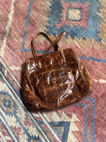 The Vintage Furia Leather Bag is a stylish Italian-made clutch crafted from crocodile leather. With a rich brown exterior, this handbag exudes a chic and sophisticated look, perfect for the fashion-forward woman. The unique crocodile leather material adds a touch of luxury to the overall design, making it a standout piece in any wardrobe. Ideal for a night out or special occasion, this vintage Furia bag combines classic elegance with modern style.