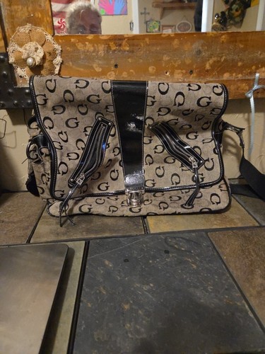 The VTG Y2K Guess Signature Bag is a vintage satchel/top handle bag with a rectangular shape and double black faux leather handles. It features a logo pattern, silver hardware, and a buckle closure. The exterior material is a blend of faux leather and canvas in a black color, with a gray fabric lining. This medium-sized bag is perfect for casual occasions and has inner pockets for added convenience. The Guess brand adds a touch of retro style to this classic and versatile handbag.
