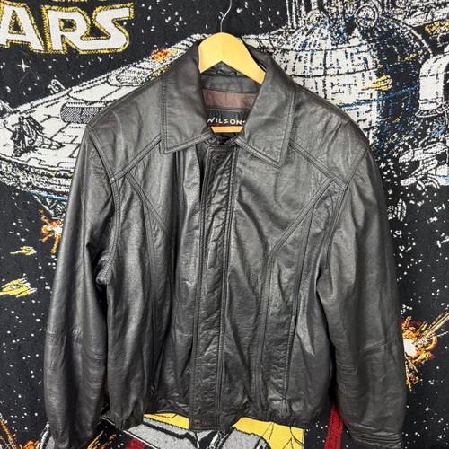 Vintage Wilsons The Leather Experts bomber jacket in black leather. This classic piece features a full-zip front with a snap-button placket, a pointed collar, and a quilted Thinsulate Ultra insulated lining for added warmth. The exterior showcases a timeless paneled design with an elasticized waistband for a comfortable fit. Measurements: • Pit to Pit: 22.5" • Length: 27" • Sleeve: 19.5"