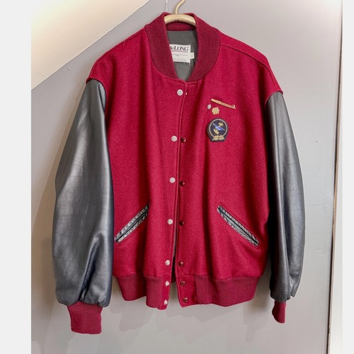 Amazing early 2000s DeLong varsity jacket in gorgeous burgundy / maroon with black leather sleeves. Features button-up front, ribbed cuffs and hem, and two front pockets with leather trim. Includes embroidered patch and lapel pins.