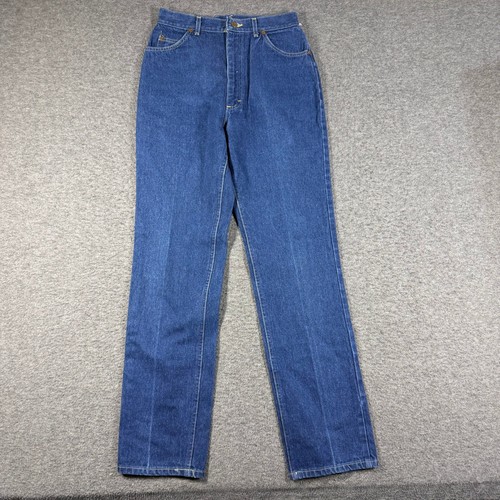 Vintage Lee high waisted jeans in a medium wash denim. These classic straight leg pants feature a traditional five-pocket design, contrast topstitching, and a secure button and zip fly closure. Constructed from durable non-stretch cotton denim, they offer a timeless silhouette with a flattering high-rise fit. Measurements: • Waist: 14" (28" doubled) • Rise: 13" • Inseam: 31" • Leg Opening: 7.5" • Hips: 19.5" (39" doubled)