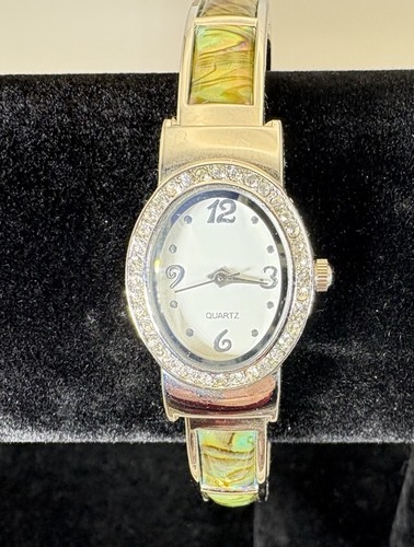This vintage Avon silver tone bracelet watch features a classic design with a bangle band and polished case finish. The watch has quartz movement and a 12-hour dial with Arabic numerals and dot indexes. The oval watch shape and white dial color make it a stylish accessory for women. The watch comes with a new battery and is a unique piece from the 2000s, making it a great addition to any jewelry collection.