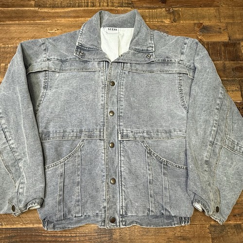 This vintage 80s Guess Georges Marciano denim jacket in men's size M is a stylish and timeless piece with a bomber jacket style and spread collar. Made of cotton denim, this casual jacket features snap closure, pockets, and a solid gray color. It is perfect for the winter, fall, and spring seasons, and is machine washable for easy care. The jacket also includes the iconic Guess logo accents and embodies a retro 80s and 90s theme, making it a versatile and trendy addition to any wardrobe.