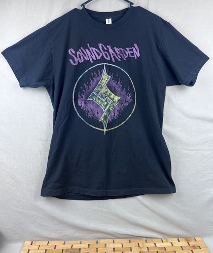 Soundgarden band t-shirt featuring bold front graphic and tour-style back print with cities listed. Great for fans of grunge, alternative rock, and vintage-style band tees. Measurements: • Chest: 42” • Length: 28” • Sleeve: 8” Condition: • Pre-owned with visible fading/distressing • Graphic has worn vintage look • No major holes noted