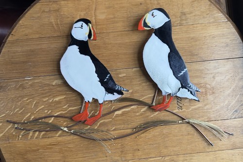 this is a hand-painted MCM Atlantic Puffin sculpture, crafted from enamel and metal decorative pieces It measures about 17” long x 10” tall Please see photos for condition. We do a quick cleaning on all items More cleaning may be needed If you have any questions please ask and we will do our best to answer them. Thank you for visiting our store, MnT