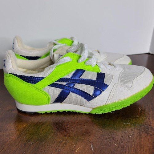 Brand: ASICS Item: Low-top athletic shoes with classic side stripes and bright retro styling. Color: White with neon green overlays and navy blue stripe logos; neon green rubber outsoles. Size on shoe: 5 1/2 Country of origin: Made in Taiwan. Style/Model code: DTM3275. Materials (per tag): Polyester upper. Logos/branding: asics on tongue and heel; signature striped side panels. Details: Lace-up closure, padded collar, low-profile silhouette, nubby traction outsole.