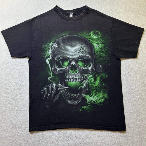 Edgy illustrated tee with distressed finish and bold alternative artwork, perfect for collectors seeking rare early 2000s grunge aesthetic pieces. Condition: Excellent pre-loved with slight fade Measurements: Chest: 19 Length: 26 #Vintage #Y2K #Grunge #Alternative #Graphic